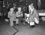 Two club youngsters of the Fort Worth Boys' Club that Santa Claus made happy Wednesday afternoon at the annual Christmas party at the club building are, left to right, Lonnie Temple, son of Mr. and Mrs. W. Temple and David Wayne Wilkerson, son of Mr. and Mrs. W. H. Wilkerson. They are kneeling in front of a Christmas tree with their hands filled with a bag of mixed whole nuts and apples and oranges with Santa Claus, kneeling, handing a stripped sock to David. J. A. Gooch is Santa Claus, wearing the costume and a mask. Published in the Fort Worth Star-Telegram morning edition, December 24, 1942.