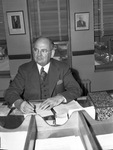 Finis L. Clampitt, postal inspector to retire from active duty, seen sitting at his desk signing papers.