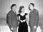 Tarrant Field soldiers are attending Fort Worth Advertising Club's Christmas party. Two of them are pictured here with Mrs. Walter Douning of Fort Worth. They are Sergeant (Sgt.) Roy Anthony, left, and Private First Class (Pfc.) Bernie Little. They are shown standing in a room in front of a dinning table and discussing Santa Claus between dances at the party. Mrs. Douning is wearing a black dress and a hat. Both men are wearing their army uniforms. Published in the Fort Worth Star-Telegram evening edition, December 24, 1942.