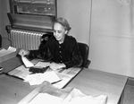 Miss Anna L. Berry is celebrating 25 years as a civilian employee with the Army Air Force (A. A. F.). She works as a supervisor of classified mail and records for the Flying Training Command. Her work began in 1917 during World War I. Miss Berry is shown working at her desk. She is wearing a button-up velvet dress. On the desk are various documents. On a table in the background is a telephone.