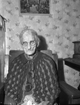 Mrs. W. M. Holcomb is celebrating her 100th birthday on January 2, 1943. She was born and raised in Arkansas. She married Mr. Holcomb when she was 18 years old. After the Civil War, the couple moved to Texas and settled near Ladonia, Texas. Mrs. Holcomb has four children. She lives with her daughter, Mrs. J. C. Payne, in Fort Worth, Texas. Mrs. Holcomb is shown sitting in a chair, wearing a dress and a crochet shawl and eyeglasses.
