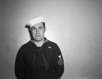 W. H. Aldrich is an aviation machinist's mate third class in the United States Navy. He is home in Fort Worth, Texas, on a furlough for the first time in two years. He is spending the time off with his parents, Mr. and Mrs. H. E. Aldrich. W. H. Aldrich has been stationed in Hawaii and was there during the Pearl Harbor attack. He is shown standing against a wall, dressed in his military uniform.