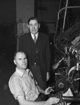 Several workers in the Fort Worth Star-Telegram's fourth floor composing crew are military veterans. Sitting at the Linotype machine and smoking a cigar is W. C. McMahan. Standing behind him is Jesse Derden. Mr. McMahan is a veteran of World War I. He is dressed in a striped button-up shirt with cuffed sleeves and trousers. Mr. Derden is a veteran of the Spanish American War. He enlisted when he was 19 years old. He is wearing a three-piece suit.