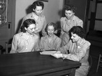 Red Cross workers. Left to right, Miss Mabel Coffin, Richmond, Indianapolis; Miss Lydia Glover, Chicago and Miss Mildred Tate, Chicago. Standing, left, Miss Avanelle Spangler, Peublo, Colorado and Miss Gertrude Morris, Milwaukee.