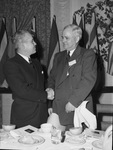 The Fort Worth Sales Managers Club is holding its 20th annual banquet at the Hotel Texas in Fort Worth, Texas. In attendance, left to right, are Ralph W. Carney and Homer Covey. Mr. Carney is the principal speaker at the event. He is dressed in a dark, double breasted suit. Mr. Covey is wearing a double breasted suit. He and Carney are shaking hands. They are standing behind a dining table. Behind them, lined against the wall, are flags of various countries.