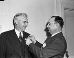 The Fort Worth Sales Managers Club is holding its 20th annual banquet at the Hotel Texas in Fort Worth, Texas. In attendance, left to right, are Joe Briley and C. D. Wallis. Mr. Briley is a salesman at the Waples-Platter Company. He is one of 16 salesmen receiving a distinguished sales award pin for outstanding selling during 1942. He is dressed in a three-piece pinstripe suit. Mr. Wallis, treasurer of the Club, is presenting the award. He is wearing a suit.