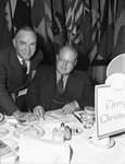 The Fort Worth Sales Managers Club is holding its 20th annual banquet at the Hotel Texas in Fort Worth, Texas. In attendance, left to right, are P. Frank Walsh and R. Mayo Bowen. Mr. Walsh is the program chairman. He is dressed in a double breasted suit. Mr. Bowen is the toastmaster. He is wearing a three-piece suit. They are gathered around a dining table. On the table is a sign that reads "Merry Christmas." Lined up against the back wall are flags from various countries.