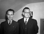 Marsline Moore (not pictured), the veteran manager of the Worth Theater, is quitting to devote his time to ranching. His departure is resulting in nine management shifts at local theaters. Involved in the changes, left to right, are Lonnie Hicks and Ray Jones. Mr. Hicks, currently treasurer at the Hollywood Theater, is moving to the same position at the Worth. He is dressed in a double-breasted pinstripe suit. Mr. Jones is the manager of the Hollywood Theater. He will be replacing Moore at the Worth. He is wearing a three-piece suit and eyeglasses.
