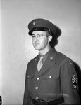 Technical Sergeant Joseph F. Fuller is an officer in the United States Army. He is home on a three-day leave from Camp Robinson, Arkansas. He is spending his time off in Fort Worth, Texas, with his parents, Mr. and Mrs. J. M. Fuller. Sergeant Fuller is a graduate of North Side High School and attended the University of Chicago. He is shown standing against a wall, dressed in his military uniform and wearing eyeglasses.