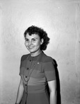 Miss Flora Jane Korteff married Eugene Newman on Christmas Day, 1942. She is the daughter of Mr. and Mrs. George Korteff. The newlyweds are planning to make their home in Fort Worth, Texas. Mrs. Newman is shown standing against a wall. She is wearing a striped, button-up blouse and a beaded necklace.