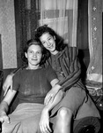 New residents. Mrs. J. C. Chestnut and her daughter, Mary Jo. Mrs. Chestnut is shown sitting in an armchair with her daughter hugging her from the side. Mary Jo is sitting the on the chair's armrest and both her and he mother are smiling at the camera. Mrs. Chestnut is wearing a knit top with a thick skirt and Mary Jo is wearing a striped, knotted jacket with a skirt, as well. Behind them is a window with curtains. Mr. Chestnut received a promotion from an agent in Odessa, Texas to train dispatcher here for the Texas and Pacific Railroad. Published in The Fort Worth Star-Telegram Evening Edition January 4, 1943.
