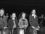 Fort Worth residents bowed their heads in prayer for an early victory in the war and raised their voices in praise for blessings of the past year. Here, children are singing at the joint services at Worth Theater. Four young girls are standing in the audience and looking up. Published in the Fort Worth Star-Telegram, January 1, 1943.