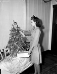 Miss Monteree Cobb is dismantling her Christmas tree after the holidays. The small tree is positioned on a table covered with fake snow. There are photographs of men in Armed Forces beside the tree. Miss Cobb is storing the ornaments inside a shoe box until next Christmas. She is wearing a button-up blouse and a skirt.