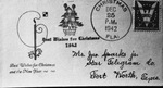 Envelope sent from Christmas, Florida. There are two cachets on this cover. One is a Christmas tree with lighted candles and a sentiment reading "Best Wishes for Christmas, 1942." The other features a holly branch and the words "Best Wishes for Christmas and the New Year." It is the the cachets were stamped on the cover at the point of mailing. This photograph was published in the January 10, 1943 morning edition of the Star-Telegram.