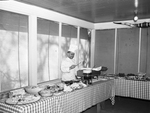 An unidentified man serving food during a party for Chip Roberts at Shady Oak Farm. The man is wearing a chef's hat and coat, and is holding a serving fork with a piece of meat on it while standing behind a table that is laid out with other types of food.