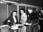 Three unidentified women serving themselves food on the porch at Shady Oak Farm during a party for Chip Roberts. The woman on the left is possibly Ruth Carter.