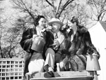 Amon Carter, Sr. (center) sits with two unidentified woman at Shady Oak Farm during a party for Chip Roberts.
