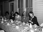 Amon Carter, Sr. (second from right), sits with an unidentified group of men and women at Shady Oak Farm during a party for Chip Roberts. The man second from the left is possibly Lawrence W. "Chip" Robert, Jr.