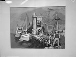One of the colorful silk screen prints ,"Oyster Pier," by Harry Gottlieb, included in the Museum of Modern Art Silk Screen Print Show in the gallery of the Fort Worth Public Library. The show is sponsored by the Fort Worth Art Association. The print depicts a group of people fishing on a boat.