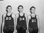 The Texas Christian University basketball team is entering the final week of the 1942-1943 season. They will meet the Rice University Owls in one of their final games. Coach Hub McQuillan's Frogs will field a different starting lineup against the Owls after three boys left to serve in the Army Air Force. Preparing for the match up, left to right, are Lonnie Dowell (no. 20), Jim Pattee (no. 34), and Floyd "Zeke" Chronister (no. 21). They are standing against a wall, dressed in their basketball uniforms.