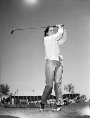 Mrs. John T. Mays, golfer who tied for second best qualifying score in the Fort Worth, Texas, women's golf tournament at Ridglea Country Club. She is standing on the golf course, wearing a long-sleeve blouse and trousers. She is swinging a golf club.