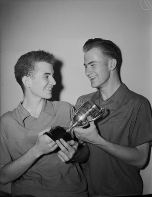 Rufus Garrett, left, and John Buster, of Paschal High School, debate winners in the district Interscholastic League contest, who will compete in the regional meet at Denton, Texas. They are standing against a blank wall, holding their trophy. Both boys are wearing collared shirts.