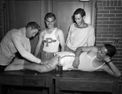 C. D. Allen, Polytechnic High School track and field athlete, getting his legs massaged by Coach Charles Berry. Allen is lying on a table, wearing a sleeveless shirt and shorts. Coach Berry is standing at the far left. Bob Henderson, center, and Carl Lohrke, right, are standing behind the table. Allen, Henderson and Lohrke scored the majority of the school's points at the last track meet, when Polytechnic won the district title.