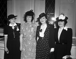 Attending the state nurses' convention in Fort Worth, Texas, were, left to right, Miss Lorena Murray, of St. Louis, Texas, Miss Cecilia E. Walsh, of St. Louis, Texas, Miss Emma Laughman, of Tyler, Texas, and Miss Mildred Aubrey, of McKinney, Texas. Miss Murray is wearing a dark-colored dress, a hat and eyeglasses. Pinned to her dress bodice is a flower. Miss Walsh is wearing a floral print dress, a pearl necklace and a hat. Miss Laughman is wearing a polka-dot dress, a hat, a coat and gloves. She is holding a handbag in her left hand. Miss Aubrey is wearing a long-sleeve dress and a hat. She is holding a pair of gloves in her left hand.