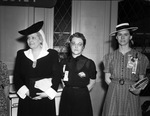 Attending the state nurses' convention in Fort Worth, Texas, were, left to right, Zoe Austin Jones, of Mineral Wells, Texas, Hilda Keplar, of Vernon, Texas, and Mrs. W. T. Anderson, of Galveston, Texas. Miss Jones is wearing a long-sleeve dress and a hat. She is holding a handbag. Miss Keplar is wearing a short-sleeve dress and eyeglasses. She is standing with her arms behind her back. Mrs. Anderson is wearing a short-sleeve, polka-dot dress and a hat. She is carrying a purse in her left hand.
