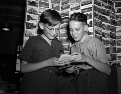 Winners in the McLean Junior High School Hobby Club Show, Harold Farrington, left, and Stewart Cecil. Harold is a collector of miniature elephants and Stewart collects postcards. Stewart is showing Harold some of his collection. Postcards are displayed on a poster board behind the boys. Both are wearing short-sleeve collared shirts and trousers. Harold is wearing eyeglasses.