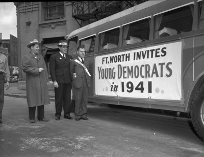 Young Democrats of Texas; Buses; Signs (Notices); Coats; Meetings; Young Democrats of Fort Worth; Bus travel