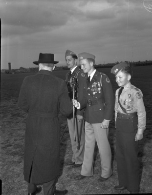 During an inspection of Fort Worth, Texas', Reserve Officers' Training Corps (ROTC) cadets, J. W. Nichols (back to the camera) presents a saber to Lieutenant Colonel Jackson R. Robinson for high marksmanship ability. Cadet Colonel Robert C. Haltom is on Robinson's right, and Lieutenant E. Bruce Peters, of Jennings Avenue Junior High School, is on his left. The cadets are wearing their ROTC uniforms and Nichols is wearing an overcoat, a hat and trousers.