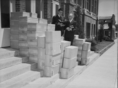 Roland Leath, left, music director of the Travis Avenue Baptist Church, and Reverend C. E. Matthews, pastor of the First Baptist Church at Longview, Texas, inspecting a shipment of song books. Both men are wearing suits. The packages are stacked on the steps in front of the Travis Avenue Baptist Church.