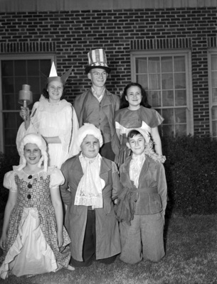 A portion of the cast of which presented "Texas Under Six Flags" at J. P. Elder Junior High School. Left to right: (front row) Mary Fowler, Kenneth Reed and Lee Allen Martinec; (back row) Jimmie Sparks, Kenneth Morrow and Dale Flanagan. The group is shown outside in front of a brick building. The three on the front row are kneeling on the ground and those in the back row are standing. The students are wearing various costumes. Jimmie is dressed as the Statue of Liberty and Kenneth Morrow is dressed as Uncle Sam. The others are wearing wigs, coats and dresses that are reminiscent of the era when America was founded.