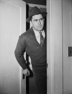 The Fort Worth Cats' newly acquired right-handed pitcher Ray Starr, is peering into Cat headquarters. Iron Man, as he is know, signed a contract with the Cats and reported to LaGrave Field for a workout. He is wearing a hat, collared shirt, necktie, sweater, and trousers.