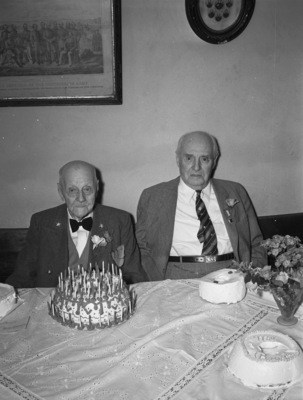 Left to right is General L. N. Baugh and Judge Tom Simmons. General Baugh is the Texas Commander of the United Confederate Veterans. He is celebrating his ninety-second birthday at a party held for him on Sunday. There is a cake covered in candles sitting on the table in front of him. General Baugh is wearing a dress shirt, bowtie, vest, and a blazer with stars pinned to the lapel. Judge Simmons is wearing a suit with a flower in the lapel. Published in the Fort Worth Star-Telegram morning edition, April 22, 1940.