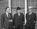 Leaders in the livestock show at Vernon, Texas, (left to right) J. L. Eggleston, secretary and treasurer of the Vernon Packing Company, Fay Eggleston, president of the company, and A. P. Peck, rancher from Vernon, Texas. The men are standing outside of a building. J. L. Eggleston is wearing a suit and eyeglasses and is holding a cigar in his left hand. Fay Eggleston and A. P. Peck are both wearing three-piece suits and hats.