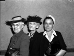 Among the district secretaries who gathered for the second annual session of the Woman's Society of Christian Service of the Central Texas Conference, which will open at First Methodist Church, were, left to right, Mrs. M. H. Hagaman, Mrs. J. K. Stroud, and Mrs. Lacy W. Goostree. The three women are standing in front of an empty wall. Mrs. Hagaman and Mrs. Stroud are wearing decorative hats, eyeglasses and long, dark coats. Mrs. Goostree is wearing a collared blouse and has her hair tied up in a scarf. She and Mrs. Hagaman are also holding handbags.