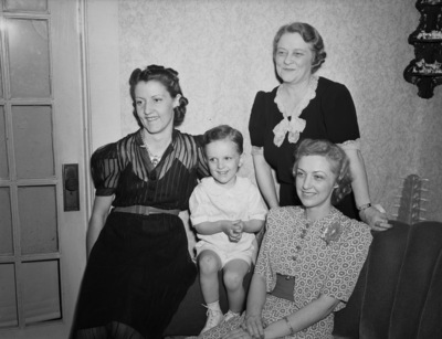 Four descendants of Sam Vaughan, a pioneer of the town of Everman, Texas, who are attending a reunion of the town. They are, left to right, Miss Mary Mann (a granddaughter), of Big Lake, Texas, Barry Connor Junior (a great-great-grandson), three years old, of Cleveland, Texas, Mrs. P. H. Hamilton (a granddaughter), of Omaha, Texas, and Mrs. Barry Connor (a great-granddaughter). The family is shown looking off to their right and smiling. Miss Mann, Barry and Mrs. Connor are seated on a couch while Mrs. Hamilton stands behind them. Mrs. Connor is wearing a matching outfit that includes a circle pattered dress and cropped jacket. Miss Mann is wearing a dark dress with a mesh, striped bodice. Mrs. Hamilton is wearing a short-sleeve dress that has lace detailing. Barry is wearing a shirt and shorts.