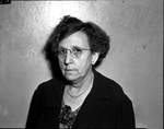 Mrs. J. B. West was born on Easter Sunday, April 25, 1886. Since then, she always celebrated her birthday on Easter, regardless of the date. For the first time since her birth she will celebrate her birthday on the day she was born, on Easter Sunday, April 25, 1943. Mrs. West is shown standing in front of an empty wall, wearing a dark coat over a floral blouse. She is also wearing eyeglasses and a pearl necklace.