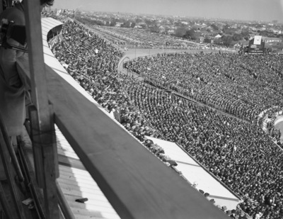 The undefeated Texas A&M Aggies are facing off against the Tulane Green Waves in the 1940 Sugar Bowl. The game is being held at Tulane Stadium. A photograph from the top of the stadium shows the packed New Years crowd. Around 73,000 fans are in attendance. The Aggies went on to win the game 14-13 after two rushing touchdowns from fullback, John Kimbrough. With a perfect 11-0 season, the Texas A&M Aggies were named National Champions.