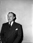 J. L. Rizer left for Camp Peary, Virginia, where he will be a Navy construction foreman with petty officer first class rank. Mr. Rizer was formerly a civilian engineer at Tarrant Field. His wife will continue to live in Fort Worth, Texas, while he is away. He is shown standing in front of an empty wall, wearing a double-breasted, three-piece suit and a necktie.