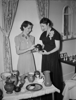 Pottery; Pitchers; Vases; Dresses; Flowers; Draperies; Sherman, John (Mrs.); Schlottman, John (Mrs.); Willman, R. M. (Mrs.); Tea; Collectibles; Collectors