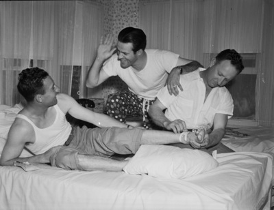Three of the Fort Worth Cats infielders live together at a house in Lake Worth. They are left to right, Clyde McDowell, Joe Abreu, and Buster Chatham. Abreu is joking around as Chatham examines the spike cut on "Rabbit" McDowell's left ankle. McDowell was injured during a game in Houston but plans to play second base during their home opener at LaGrave Field.
