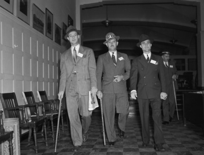 Ready for the trip to the East Texas Chamber of Commerce convention, in Marshall when they walked into Chamber of Commerce headquarters here Tuesday morning were left to right, Reed Saas, Al Pugsley and H. J. Stevens. They are three of the 26 Fort Fort Worth business men who rode in a bus to Marshall Tuesday to take part of the parade that climaxed the three day meeting. The group will return Tuesday night. All three men are seen walking, and all three men are wearing a suit, name-tag, and a hat. Reed Saas is carrying a newspaper. Al Pugsley is carrying a cigar. The hallway they are walking down features checked tile, a row of wooden chairs, several framed pictures, and a few light fixtures above.