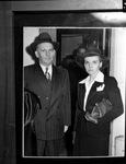 Charles Coakley, attorney, left, and Mrs. Ella B. Howard, who was brought in for questioning in connection with the slaying of Mrs. T. Karl Simmons, of Tulsa, Oklahoma. Coakley is wearing a dark, double-breasted suit, eyeglasses and a hat. Mrs. Howard is wearing a dark jacket and skirt, a hat and gloves and is holding a textured purse to her side. Other people are exiting the room in the background.