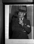 Louis Howard Senior shown standing in a doorway after the courtroom hearing in which Mrs. Ella Howard was brought in for questioning in connection with the slaying of Mrs. T. Karl Simmons. He is wearing a pinstripe, three-piece suit and a hat and is smoking a cigarette.