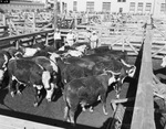 Standing behind cattle to be slaughtered are (left to right) Jeff Slocum, Guy Foley, Ferd Slocum, and Roy Weeman, Swift and Company buyer.