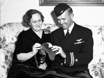 Lieutenant George W. Polk shows mother, Mrs. Adelaide Roe Polk a Japanese flying helmet.
