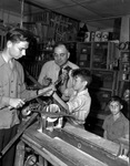 Charles McClur (left), Reverend L. L. Cooper, and Billy Jitton Junior (right) are sharpening garden tools in the workshop at Berean Baptist Church. Two unidentified young boys are standing at the far right. Reverend Cooper is helping young Billy while Charles works by himself. A hammer, a rake, a shovel and other tools can be seen on the workbench. Reverend Cooper is wearing a striped, long-sleeve shirt and eyeglasses. Billy and Charles are wearing button-down shirts and trousers.